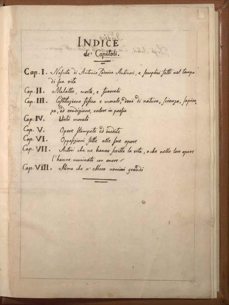 "L’Antinori nota e registra tutto: avvenimenti politici, piati e controversie giuridiche, elezioni di magistrati, deliberazioni di opere pubbliche, feste religiose, fondazioni di chiese, decessi illustri di signori o vescovi o prelati; impianti di scuole e di professioni di arti e mestieri, edizioni di libri, pestilenze, comete, terremoti, brinate, temporali; … trae vantaggio di tutto, le varie testimonianze adducendo, confrontandole, vagliandole".